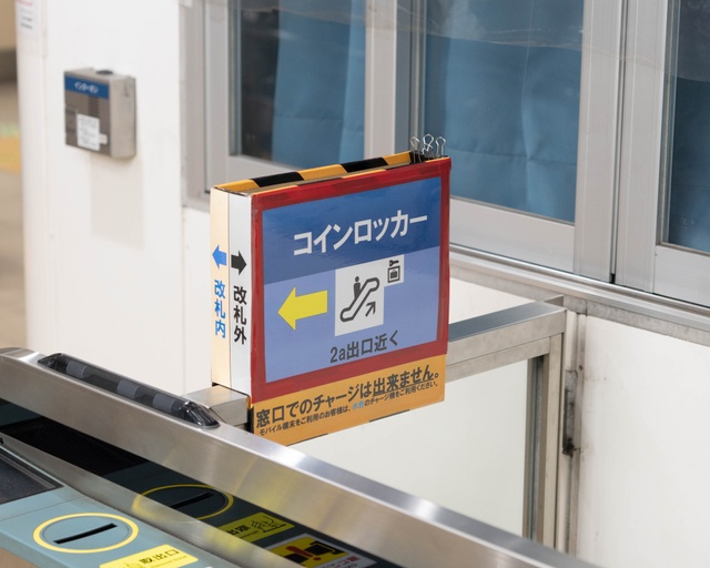 窓口の前の柵のうえに、空箱のようなサインが設置されていた。改札の内側からみると「お手洗い」「出口」などの案内が書いてあり、改札の外側からは「コインロッカー」の方向が示されている。