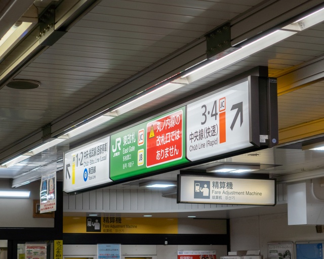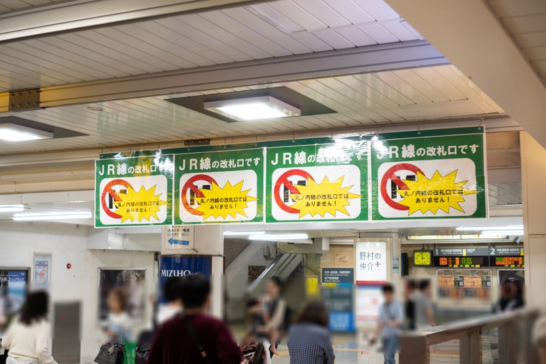 改札機の上で掲げられている、「この改札を入っても丸ノ内線には乗れない」という内容のサイン。
