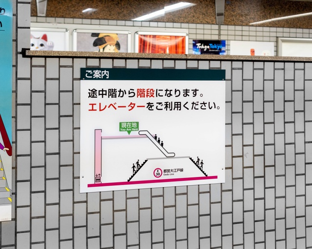 ホームに降りていくためのエスカレーターのある駅なのだが、エスカレーターは途中で終わってしまいそこから先は階段しかない、ということを図示しているサイン。階段の昇降を避けたい人にとっては罠のような構造だ。